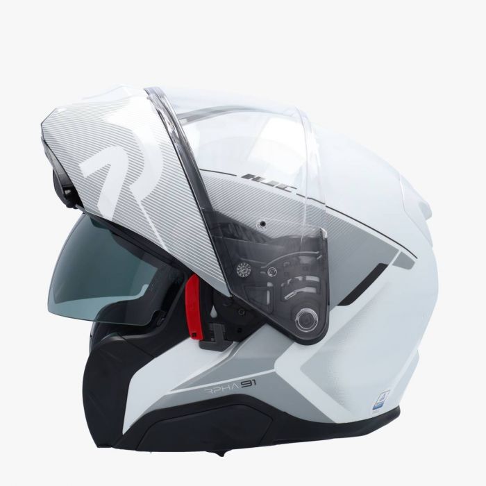 Introducing the HJC RPHA-91 Comfort Touring System Helmet- a must-have for any demanding motorcyclist who is always on the go. No matter the season, this premium helmet offers great protection, comfort, and convenience all rolled into one. It features an Integrated Matrix (PIM) Evo shell made from high-tech fibers for extra safety, a chin box that can be completely folded back allowing you to get up close and personal with your destination, plus an extra comfortable inner lining for a perfect fit. This even includes anti-bacterial properties and ear pads that are both removable and washable! Glasses wearers can also use this helmet and everybody will appreciate the ergonomic breathing reflector at the nose and integrated UV sun visor as well. To top it off, ventilation openings at the front and back of this helmet ensure optimum breathability during longer rides, while reflective parts keep you visible in low light conditions. And of course, we've included a Pinlock 120 Max Vision in case you ever fear foggy lenses! Get ready to hit the road in style with your HJC RPHA-91 Comfort Touring System Helmet today!